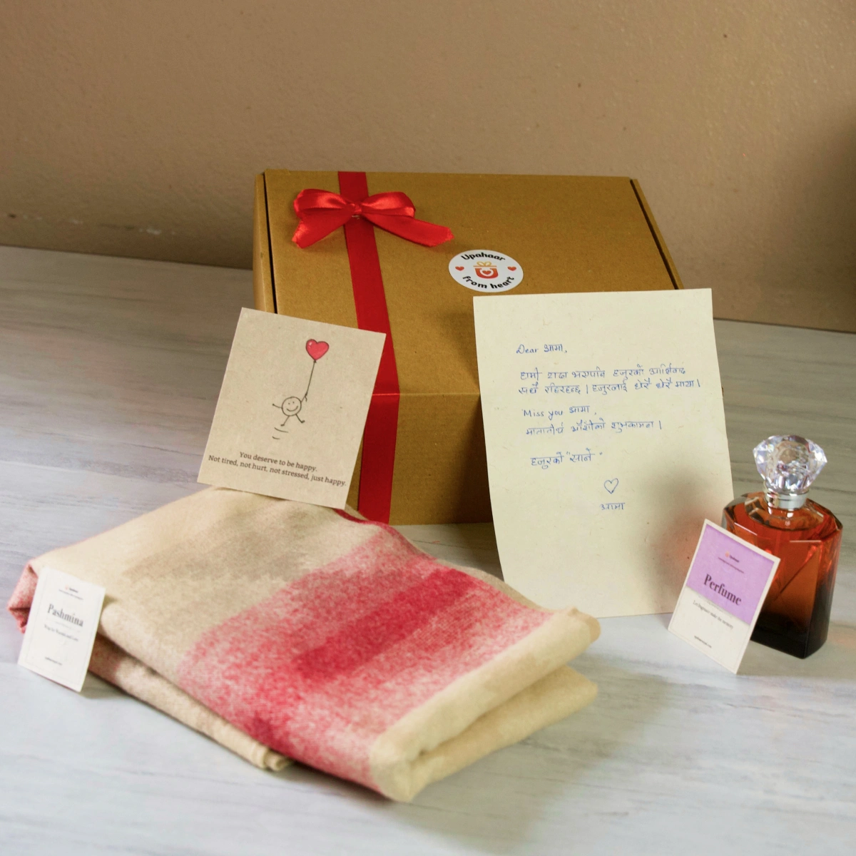 Premium Essence is our most refined offering. It features our finest Premium Pashmina—the softest wool ever woven—paired with our signature perfume and handcrafted lokta note cards. This is minimalism at its most luxurious. Quality so extraordinary it needs no embellishment. Beauty so pure it speaks for itself. Perfect for the person who has everything and values restraint as much as richness.