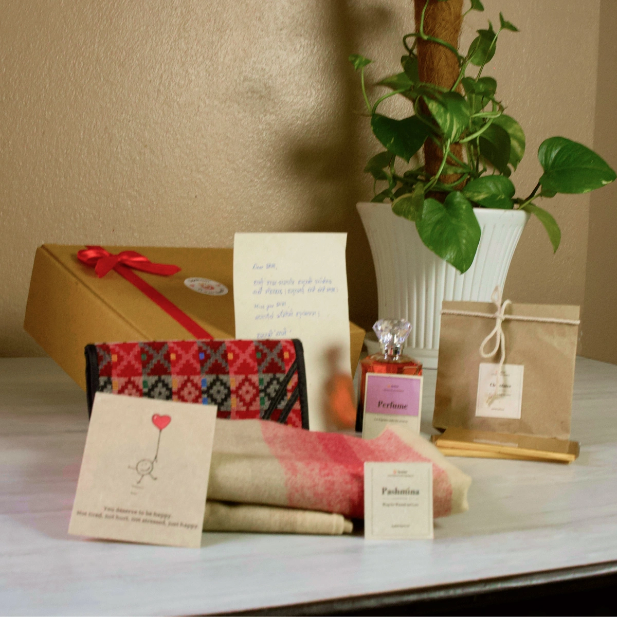 Artisan Luxe celebrates the marriage of traditional craft and contemporary indulgence. Premium pashmina hand-woven in mountain villages. Dhaka fabric patterns passed down through generations. Signature perfume and artisan chocolates that make every moment feel special. This hamper is for people who value the story behind the gift as much as the gift itself.
