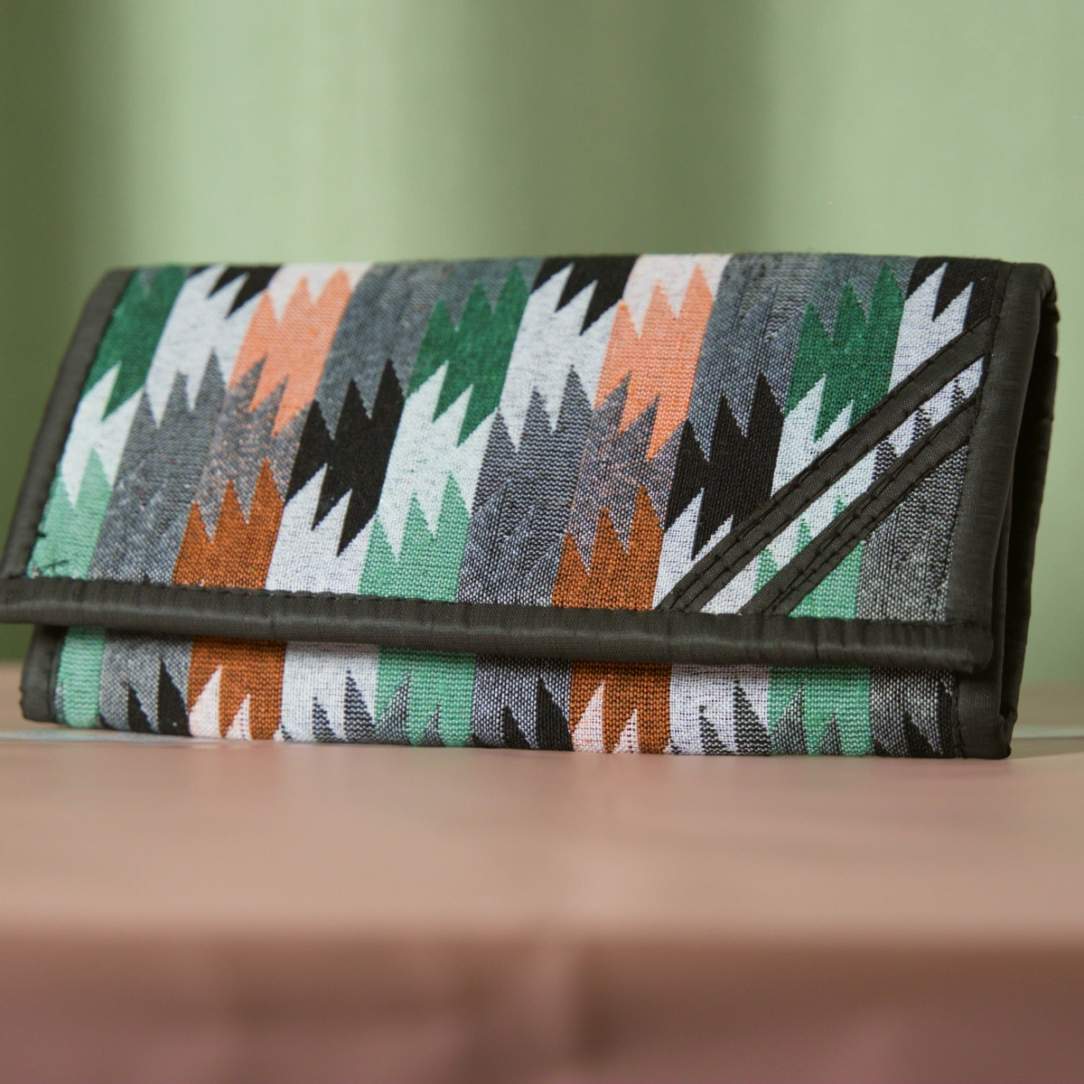 A beautifully crafted women's wallet in vibrant traditional Dhaka fabric — a stylish piece of Nepal's living artisan heritage.