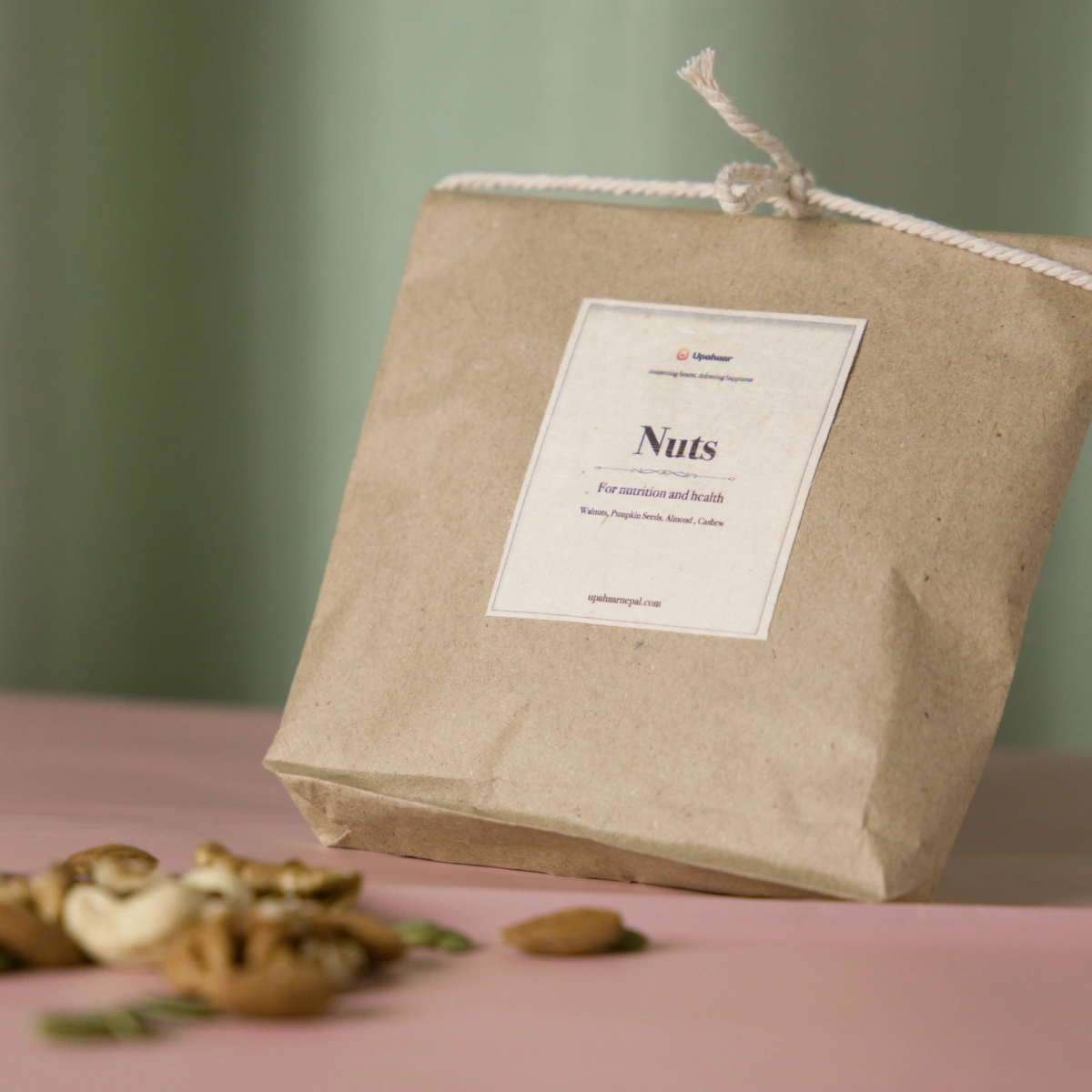 A wholesome mix of the finest Himalayan nuts in eco-friendly craft paper packaging — natural, nourishing, and made with love.