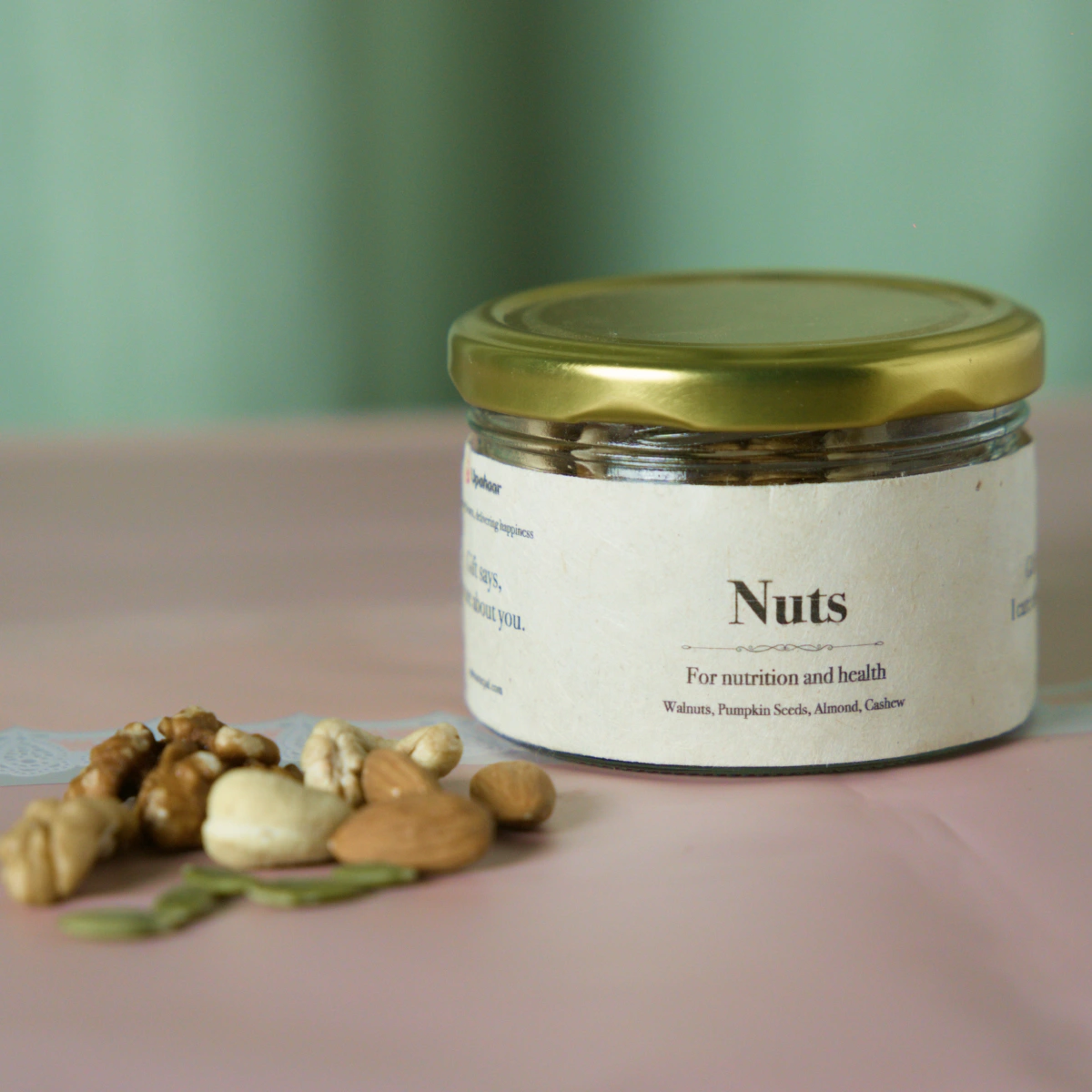 A luxurious assortment of the finest Himalayan nuts — almonds, walnuts, cashews, and more — beautifully presented in a premium glass jar.