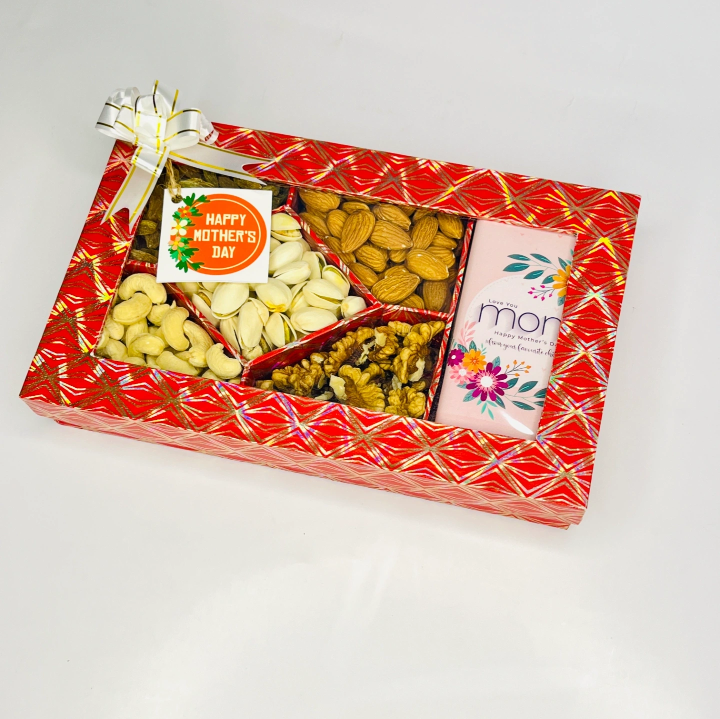 This thoughtfully curated package features a delightful selection of dry fruits—almonds, cashews, pistachios, walnuts, and raisins—paired with delicious chocolates. Perfect for gifting on Mother's Day, it beautifully blends tradition with a touch of sweetness. The combination of nutritious dry fruits and indulgent chocolates symbolizes love, care and heartfelt wishes, making it a meaningful way to celebrate and honor your mom.