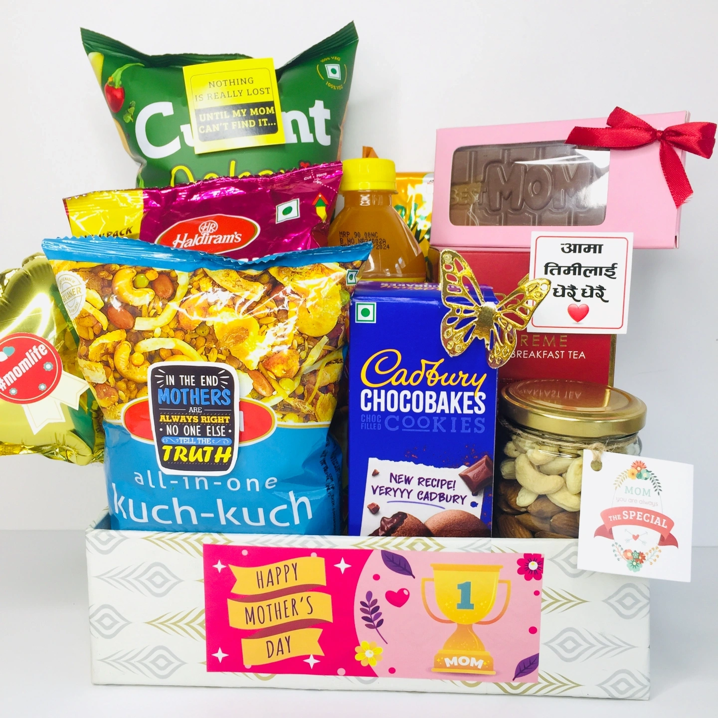 Treat your Mom to a delightful surprise this Mother's Day with our Mother’s Day Treat Box. Packed with an assortment of munchies, biscuits, cookies, and soft drinks this hamper is sure to satisfy her snack cravings. Complete with a selection of dry nuts and a personalized "Best Mom Ever" chocolate, it is the perfect way to show your appreciation. With every bite, she will feel appreciated and loved on her special day. Give your Mom the gift of pure enjoyment with this hamper.